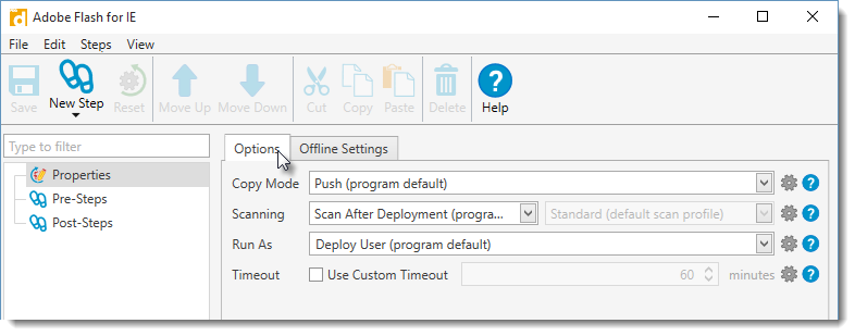 | The Auto Deployment Package Window opens with the Properties selected, and includes a section for Pre-Steps and Post-Steps. |