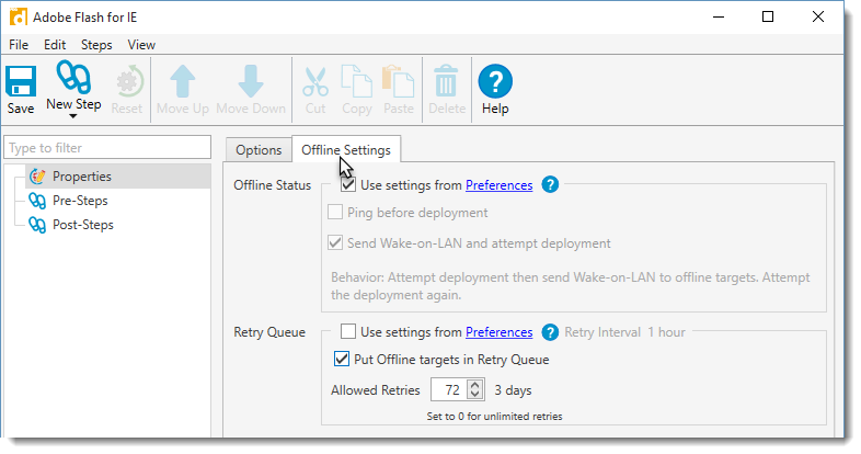 Enable or disable the Retry Queue and modify the number of retries for the package. The default settings for Retry Interval, and several other settings for offline computers, can be modified in Preferences > Deployments. Important: Requires Enterprise mode to use Retry Queue settings. |