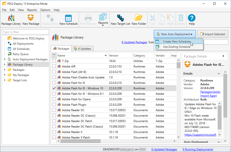 Auto Deployment allows you to automatically deploy new versions of packages as they become available in the PDQ Deploy Package Library. (Enterprise mode required.)