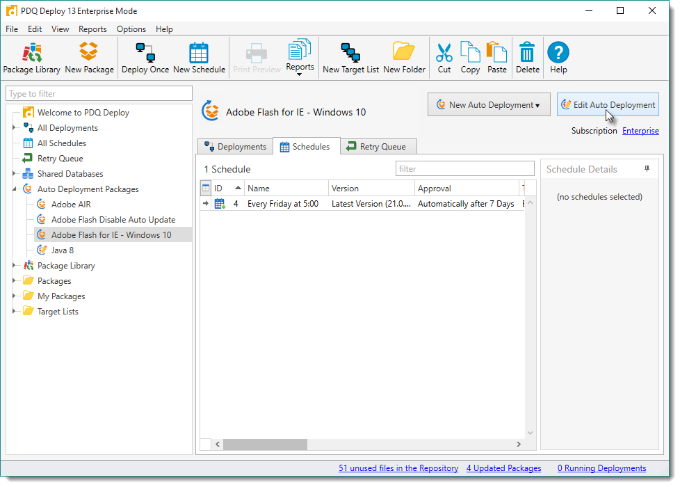 NOTE: The Package Library refreshes every 2 hours and every time PDQ Deploy opens. You also can manually refresh the library on the Main Console window (click View > Refresh or press F5). When packages are updated in the Package Library, PDQ Deploy starts counting down (according to the approval policy) to the time when any auto deployment schedules they are attached to are automatically updated. PDQ Deploy displays auto deployment updates waiting to be approved in the status bar. For information about the Approval Policy, see the Package Library Auto Deployment Settings in Preferences or the approval overrides at the schedule level in step 9.