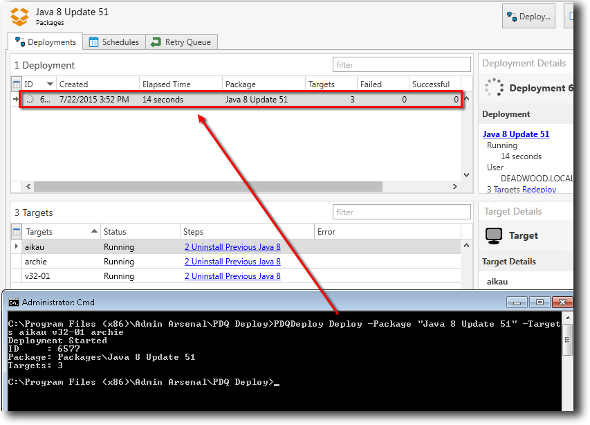 The example below shows the Java 8 Update 51 package deployed to the target computers named aikau, v32-01, and archie. Note that target computer names are delimited by spaces.