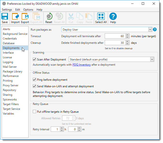 The Deployments page defines how PDQ Deploy manages deployments. It also includes the Run Package As option that defines how packages are deployed on local workstations.
