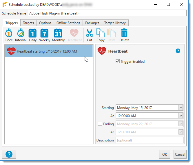 For this example we are scheduling a Heartbeat deployment of the Adobe Flash plug-in package.