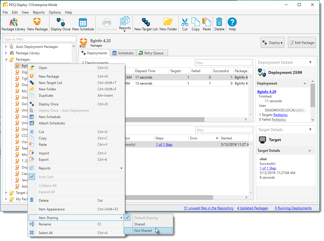 On PDQ Deploy consoles where sharing is enabled, all local PDQ Packages and folders are shared by default. Unless you specify which folders/packages should be shared, all future packages you download to your local console are shared by default. (Enterprise mode required.)