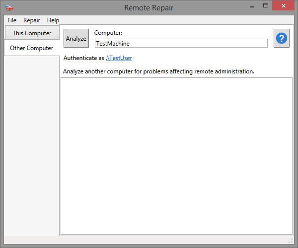 This tab allows for the analysis of another computer, usually the one that generated the error. These tests are different than those run for This Computer in that they check whether remote admin functionality is working. If there are problems that require correction, the utility must be copied to the remote computer and run locally. In connecting to remote computers it is possible to use any user and password for authentication. Click on the name of the user listed in order to change (see below). |