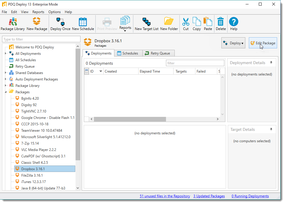 The Retry Queue is a deployment queue for target computers that are unreachable or offline during a deployment. The deployments are held in the Retry Queue and deployment is retried as per the following configured parameters. IMPORTANT: The Retry Queue is available only in Enterprise mode. For details on the Retry Queue, see Using the Retry Queue for Offline Computers. Video: Introduction to the Retry Queue (https://support.pdq.com/hc/en-us/articles/220537047) Video: PDQ Deploy Best Practices: Retry Queue |