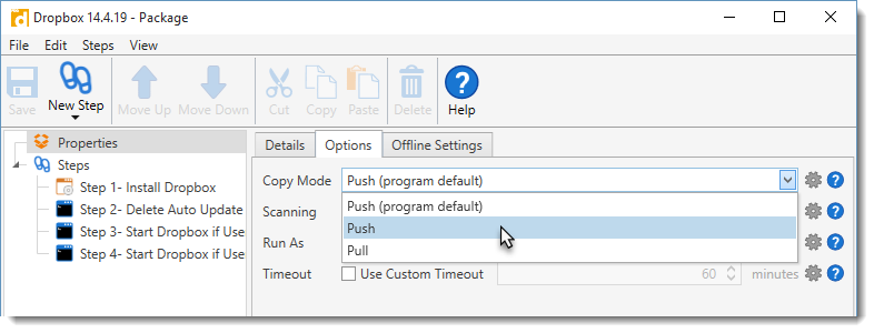 Push mode copies files to the target computers from the computer where PDQ Deploy is installed. Push mode is recommended over pull mode if the package files are located on the PDQ Deploy computer. Push mode is the default copy mode.