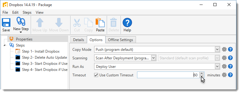 The global timeout interval is defined in Preferences; exceptions can be defined in individual package properties. When configuring your local system, it is best practice to set the shortest timeout interval as the global default in Preferences and increase the timeout interval only in individual packages. For example, if you typically deploy small packages such as browser, Java, or Adobe reader updates, you may choose to set the global timeout interval to 20 minutes. You could then increase the timeout interval for individual packages that take longer to install such as a Windows Service Pack or a package containing many nested packages.
