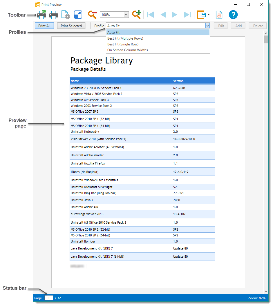 The Print Preview window allows you to setup and preview PDQ Deploy reports. Reports can be details of deployments, schedules, packages, or target lists. The Print Preview window also allows you to see a print preview of the currently active panel and grid. The components of the Print Preview window are the Toolbar, the Profile list, and the Preview page.