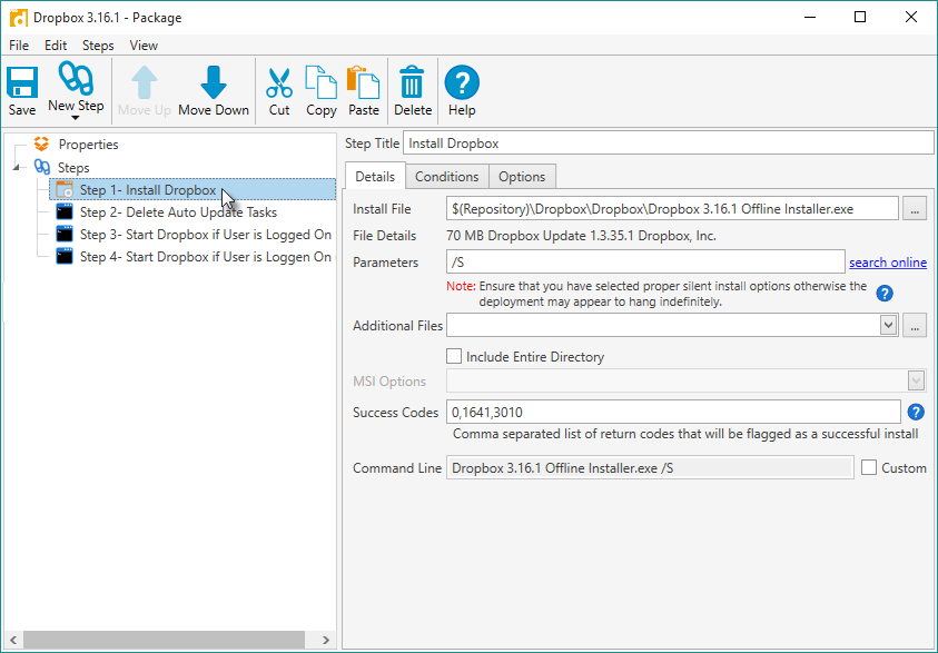 If the step fails, stop deployment and report success. NOTE: Success Codes are defined at the Package level. They are the numerical value for Windows system error codes. The default success codes are 0 (action completed successfully), 1641 (reboot initiated), and 3010 (reboot required). |