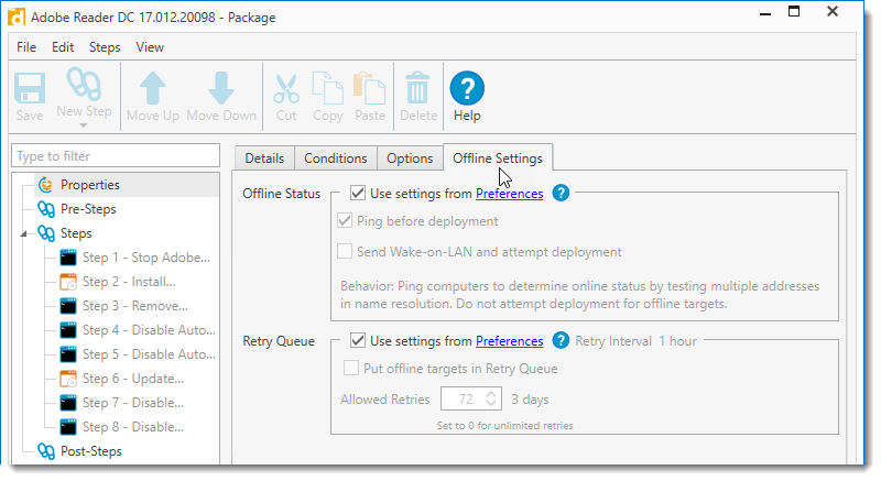 Enable or disable the Retry Queue and modify the number of retries for the package. The default settings for Retry Interval, and several other settings for offline computers, can be modified in Preferences > Deployments. Important: Requires Enterprise mode to use Retry Queue settings. |