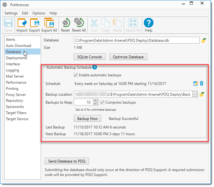 Because the PDQ Deploy database stores all package, schedule, and deployment information, it is highly recommended that you regularly backup the PDQ Deploy database. You can setup an Automatic Backup Schedule in the Database page of Preferences. The default backup schedule is weekly on Saturdays at 10:00 PM. The default will also retain 10 compressed backups. (Enterprise mode required)