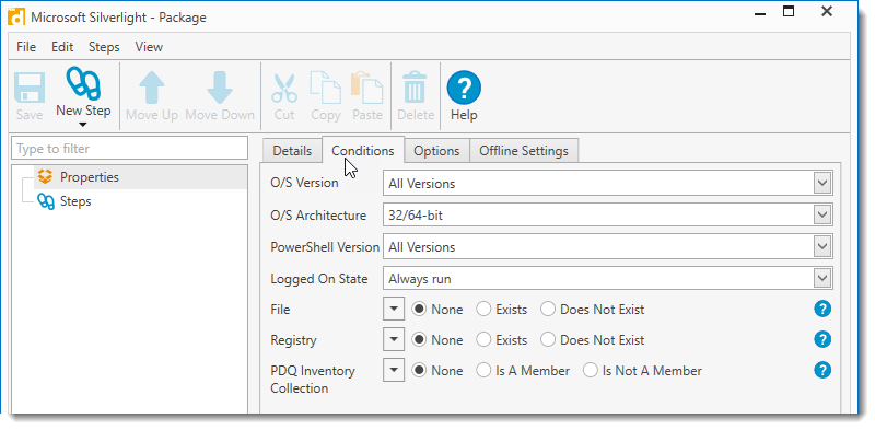 4.Specify the deployment properties on the Conditions and Options tabs.
