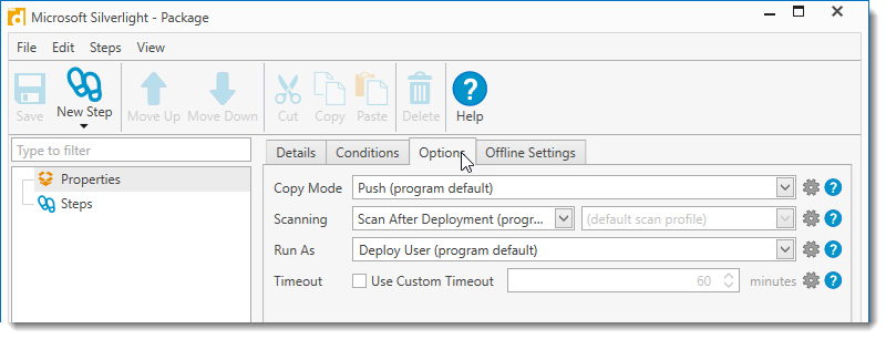 NOTE: The step level Run As option only applies to Install, Command, PowerShell, Nested Package, and File Copy steps.