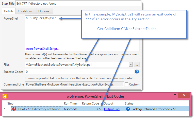This will return a value of 777 if there is an error or exception that occurs when the script is called and the step is deployed to a target: