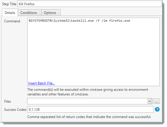 This will attach a batch file to your package and call that file from within the Command Step. The included file will be listed in the Files section of the step. |