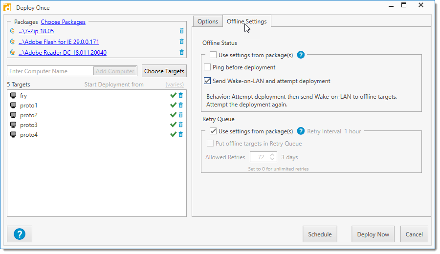 Retry Queue settings determine how PDQ Deploy handles deployments when the target computers are offline. |
