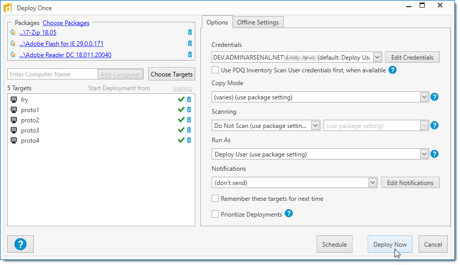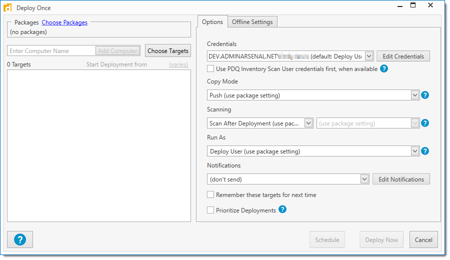 Allows PDQ Inventory's Scan User credentials to be used during the deployment. If selected, the PDQ Inventory Scan Users credentials will be used first. If no Inventory Scan User credentials exist for that target computer, the selected PDQ Deploy credentials will be used. NOTE: Local Administrator Password Solution (LAPS) can be used by if the target computer's selected Scan User credentials are configured properly to use LAPS. IMPORTANT: Enterprise mode is required in both PDQ Deploy and PDQ Inventory. If running in Client or Server mode, PDQ Inventory must also be in Client or Server mode. NOTE: This selection is saved for use the next time you start a new deployment with this window. |