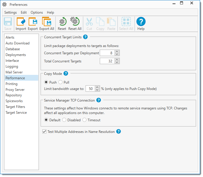 3.The Performance page defines how PDQ Deploy manages performance for deployments with limits to Concurrent Targets and a Copy Mode option that defines how PDQ Deploy copies deployment files to target computers.
