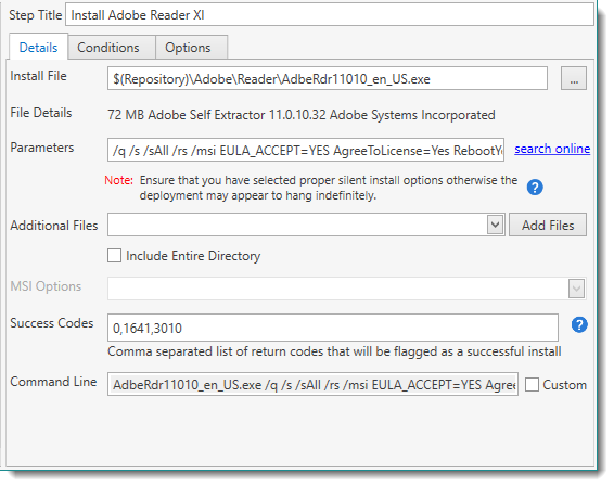 It is likely that others have been looking for the same silent option online. Searching for “install acrobat silently” for example yields a number of hits. In PDQ Deploy, after adding your install file to the Install Step of a package, you can also click search online to assist your online search. Video: PDQ Live! Google Fu: The Art of Finding Silent Parameters |