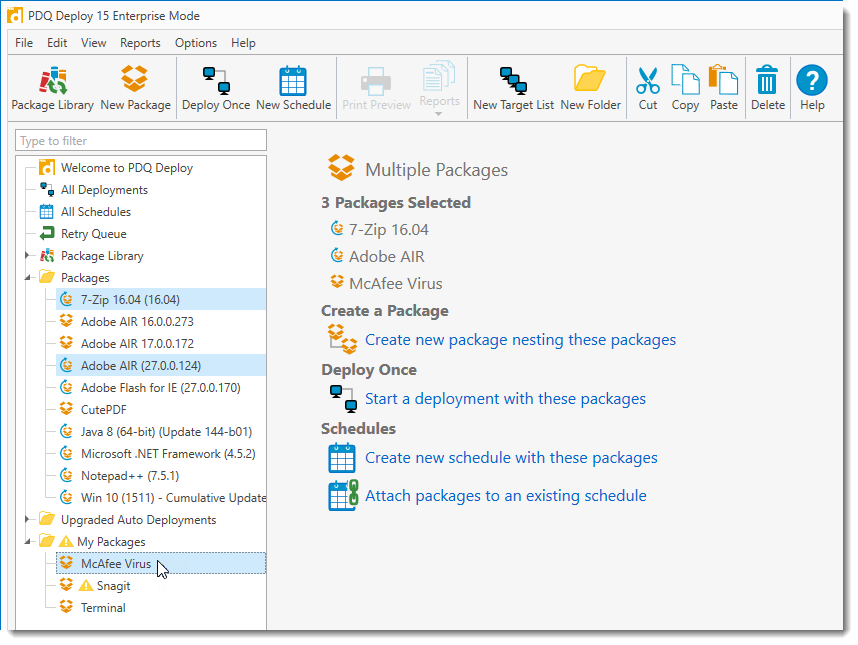 When multiple packages are selected in the tree (Shift+Click or Ctrl+Click), the Multiple Packages page opens on the right. From this page, you can perform the following actions: