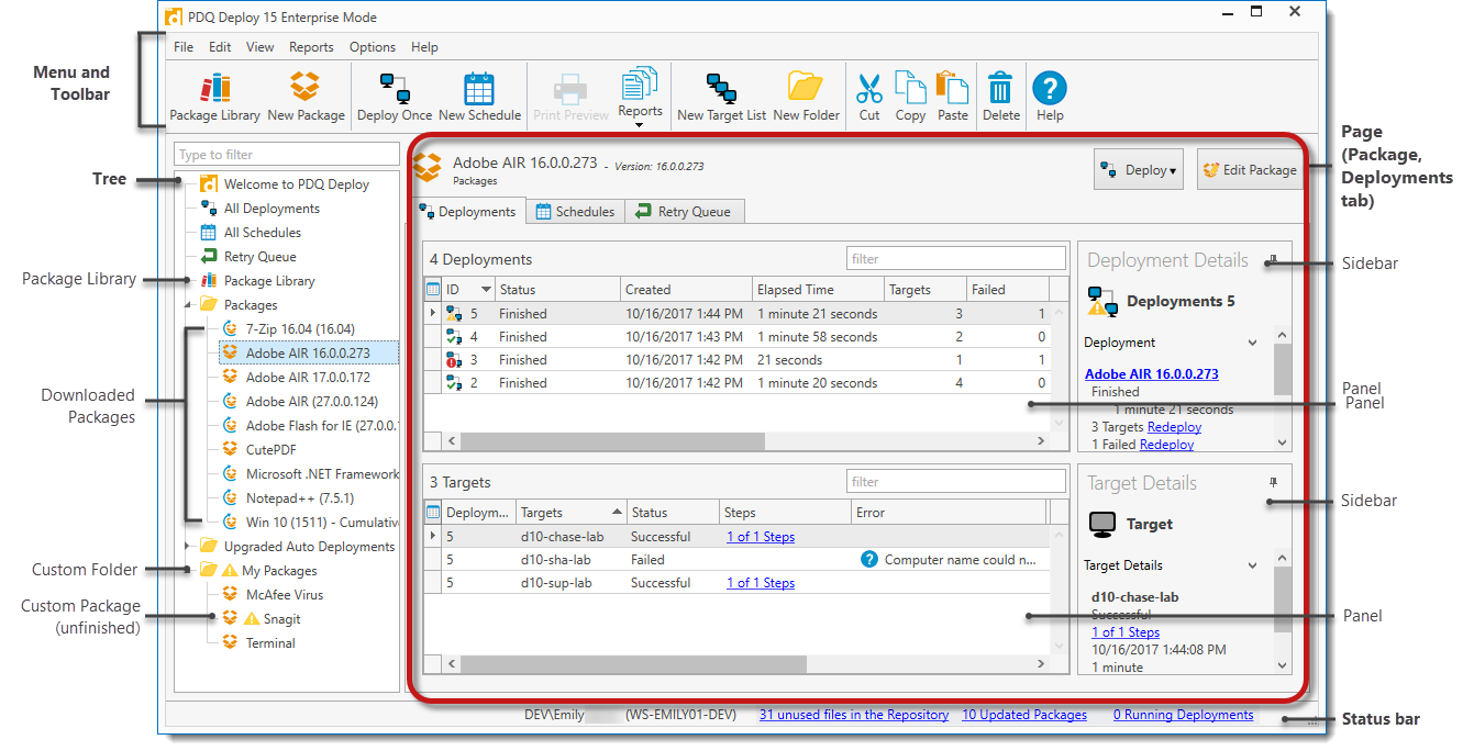Select an item in the tree to display its details in the page on the right. You can organize the tree by moving folders or creating custom folders for packages and target lists. While using Central Server, organization of the tree is on a per user basis.