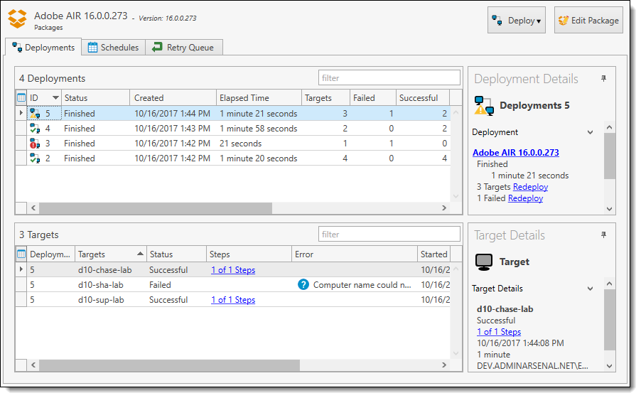For example, on the Package page you can view the deployments, schedules, and the retry queue associated with the package. Additional controls may also be available on the page header, for example, the Deploy and Edit Package buttons. If the package is set to Auto Download, the approval will also display here.
