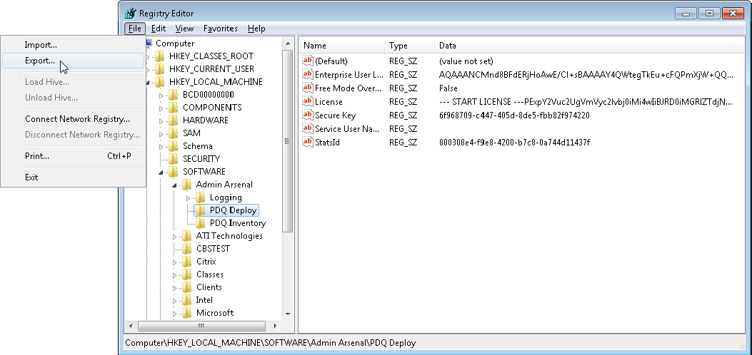 d.Copy the HKLM\Software\Admin Arsenal\PDQ Deploy key to the desktop on the new system.