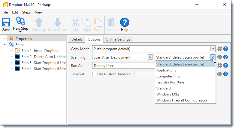 3.On the Options tab, click the Scanning drop-down menu to select the scan settings for the deployment.