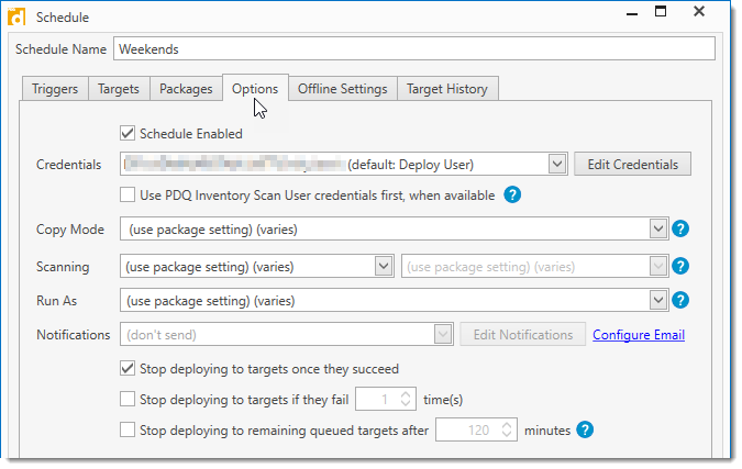 PDQ Deploy allows you to define deployment parameters on a global, manual (Deploy Once), schedule, package, or step level. Deployment settings defined for a specific schedule apply only to the deployments run from that schedule and they override the global deployment settings defined in Preferences.