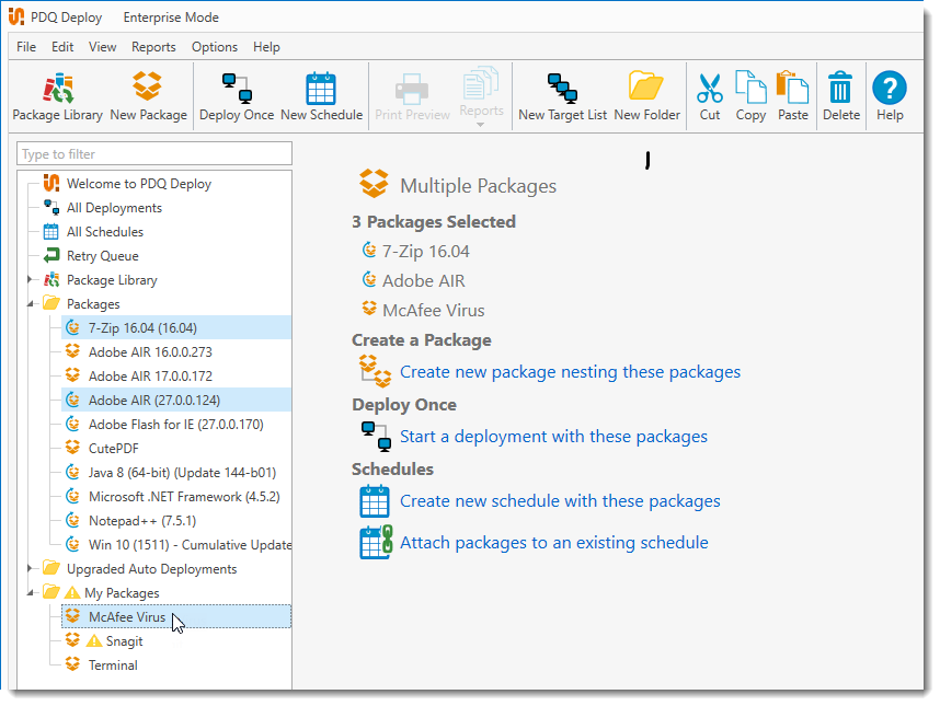 When multiple packages are selected in the tree (Shift+Click or Ctrl+Click), the Multiple Packages page opens on the right. From this page, you can perform the following actions: