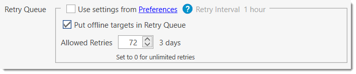 Enables the Retry Queue. By default, target computers that are unreachable or offline during a deployment are held in the Retry Queue and deployment is retried. This global setting can be overridden in the individual Package and Schedule properties. |
