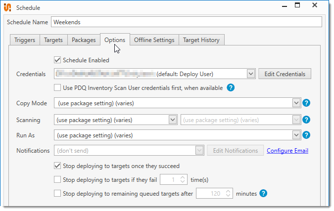 PDQ Deploy allows you to define deployment parameters on a global, manual (Deploy Once), schedule, package, or step level. Deployment settings defined for a specific schedule apply only to the deployments run from that schedule and they override the global deployment settings defined in Preferences.