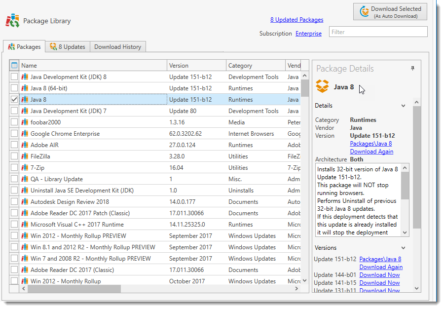 NOTE: While Enterprise license mode users do have access to older prebuilt packages, only the most recent versions will be Auto Download packages.