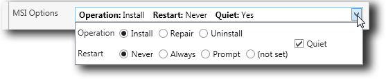 •Operation: Install is the most common option, but Repair and Uninstall are available if you need them (for .MSI and .MSP). •Restart: Some installs require restarts to complete the installation (such as when files are in use). You can decide how restarts are handled. The (not set) option does not include an option for restarting and uses the install’s default option or you can include another option on the Command Line (see below). •Quiet: Most often you will select this option (for more information, see Silent Install Options below).There may be times when you want to use a different command line option than /qn or when the install doesn’t work properly with this option. For additional information, see Supported Install Files. |