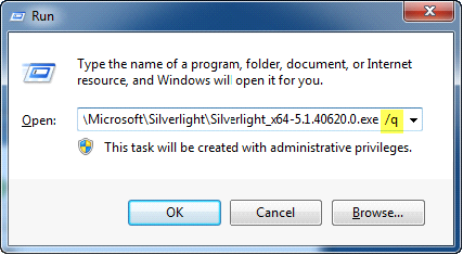 Below is an example of using the Run window to verify that Microsoft Silverlight runs silently. Note that the parameter, /q, is passed.