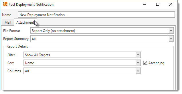 The file format for the deployment report attached to the mail notification. Options include: •Report Only (no attachment): No attachment is included and the email will only contain the summary of deployment detail included in the email body above plus any additional options selected. •Comma Separated Values (.csv): Comma-delimited text file for use in database and spreadsheet programs. •Excel 97–2003 Workbook (.xls): Spreadsheet file format for Excel 97–2003. •Excel Workbook (.xlsx): Default XML-based spreadsheet file format for Excel 2007-2013. •Web Page (.html): HTML format for viewing documents in web browsers. •Portable Document (.pdf): Adobe Acrobat file format for viewing in Adobe Reader, this is the default format. •Web Archive (.mht): Web page saved as a single file including additional resources such as images. •Rich Text (.rtf): Cross-platform document interchange format that most word processors can read and write. Retains formatting information and images. •Plain Text (.txt): Simple text only format. •Image (.png): Portable Network Graphics (PNG) is a bitmap graphics file format that supports data compression. |