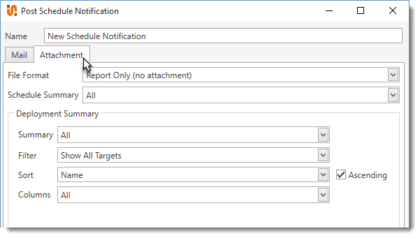 The file format for the schedule report attached to the mail notification. Options include: •Report Only (no attachment): No attachment is included and the email will only contain the summary of deployment detail included in the email body above plus any additional options selected. •Comma Separated Values (.csv): Comma-delimited text file for use in database and spreadsheet programs. •Excel 97–2003 Workbook (.xls): Spreadsheet file format for Excel 97–2003. •Excel Workbook (.xlsx): Default XML-based spreadsheet file format for Excel 2007-2013. •Web Page (.html): HTML format for viewing documents in web browsers. •Portable Document (.pdf): Adobe Acrobat file format for viewing in Adobe Reader, this is the default format. •Web Archive (.mht): Web page saved as a single file including additional resources such as images. •Rich Text (.rtf): Cross-platform document interchange format that most word processors can read and write. Retains formatting information and images. •Plain Text (.txt): Simple text only format. •Image (.png): Portable Network Graphics (PNG) is a bitmap graphics file format that supports data compression. |