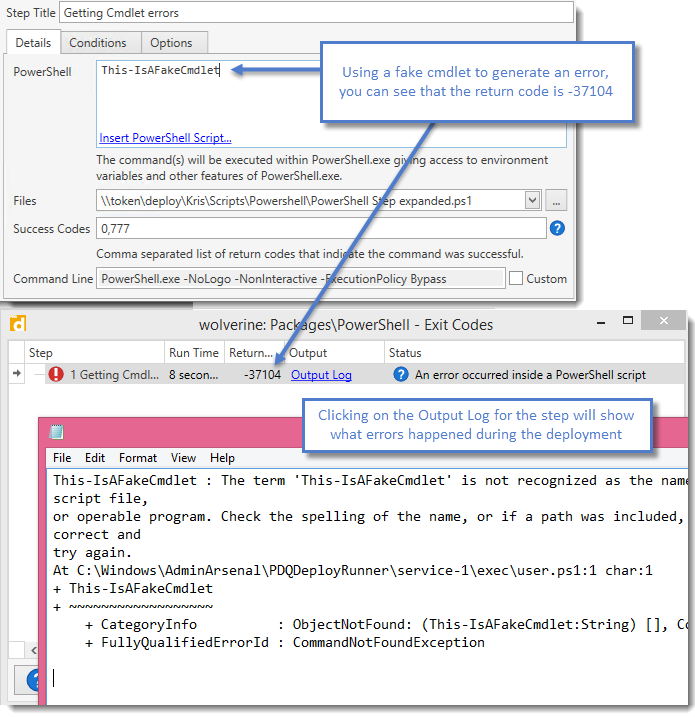 Native PowerShell cmdlets do not normally generate exit codes. Instead, any errors or exceptions are recorded in PowerShell's global variable $error (see automatic variables on Technet for more information). When deploying a PowerShell step, PDQ Deploy looks at the contents of $error for any entry that has a property and value of writeErrorSteam = $true. If any entries are found, targets with PowerShell version 3 or higher will return with exit code -37104. PowerShell version 2 targets will return with exit code 37105.