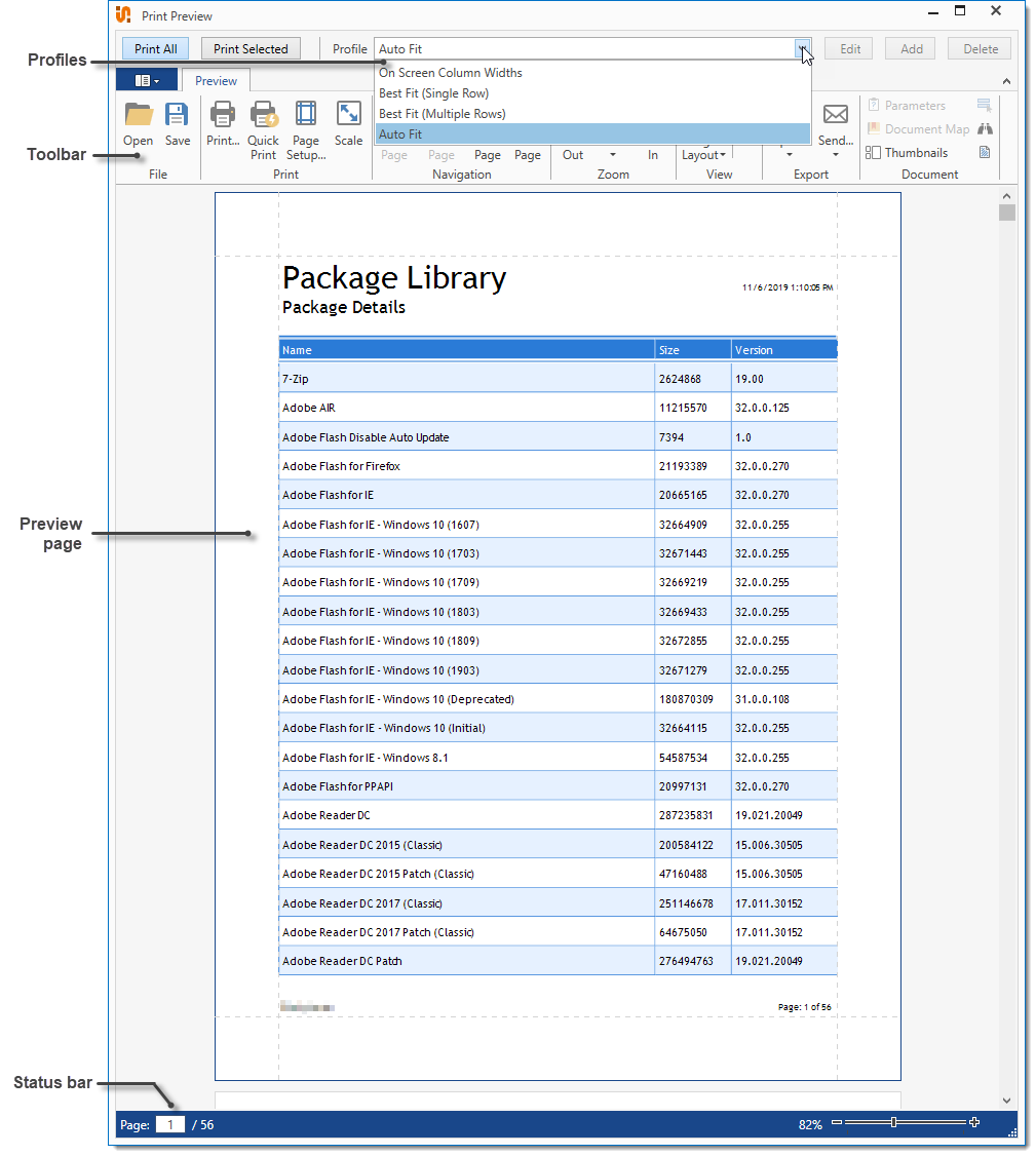 The Print Preview window allows you to setup and preview PDQ Deploy reports. Reports can be details of deployments, schedules, packages, or target lists. The Print Preview window also allows you to see a print preview of the currently active panel and grid. The components of the Print Preview window are the Toolbar, the Profile list, and the Preview page.