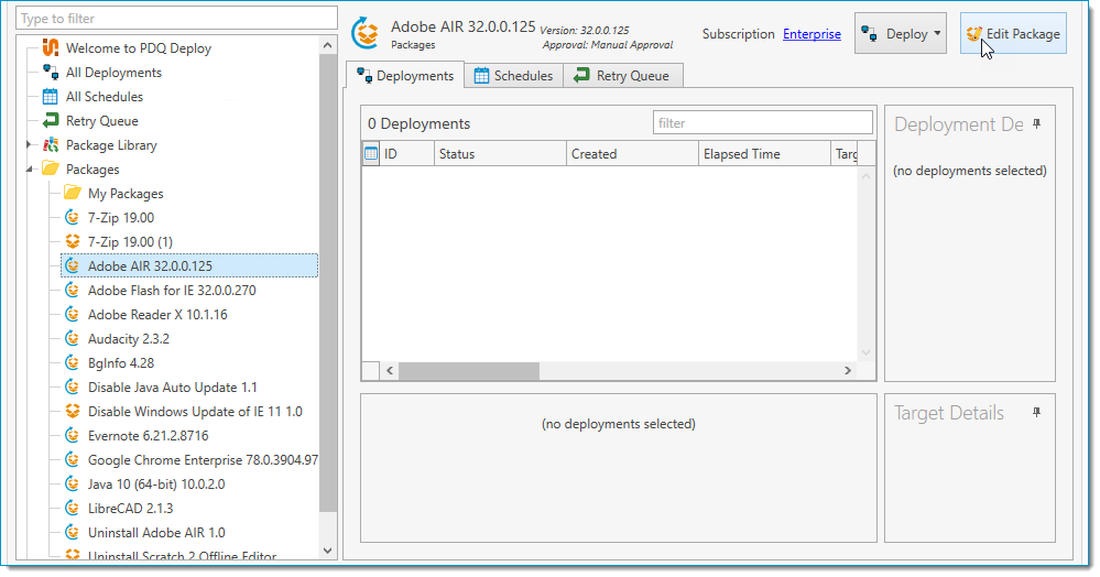 Auto Download packages are just like all other packages, however, they are set to automatically download new versions of the applications as they become available in the PDQ Deploy Package Library based on the approval. (Enterprise mode required.) The Auto Download approval policy determines when your packages will be automatically updated, unless you approve them manually, after PDQ releases updated packages in the Package Library. The default approval policy is set in Preferences but can be overridden on the package itself. Auto Downloads ensure you always have the most recent version of the application.
