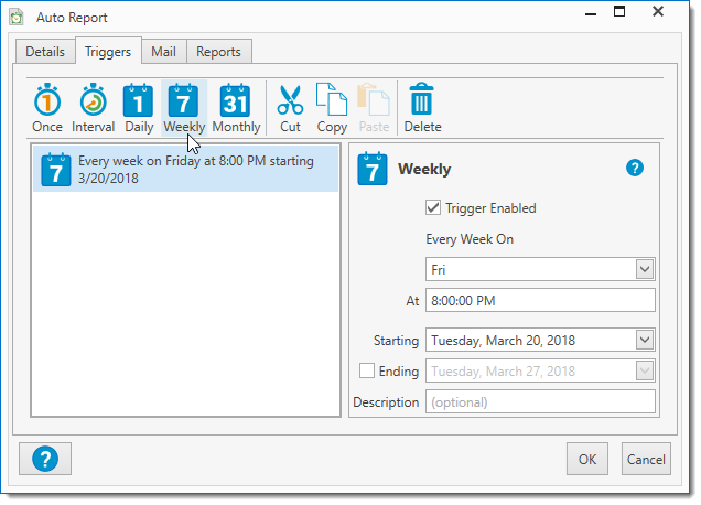 Runs every week at the same time on selected days of the week. •Trigger Enabled: Enables the trigger for use (selected by default). •Every Week On: •Day (or days) that the trigger runs. •At: Time the trigger will run. •Starting: Date the trigger starts. •Ending: (Optional) Date the trigger ends. Leaving this unchecked will allow the trigger to run indefinitely. •Description: (Optional) Description of the trigger. |