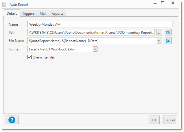 Auto Reports let you run, export, and save or email PDQ Inventory reports on custom schedules (Enterprise mode required). Auto reports are created and edited in the Auto Report window. This window contains the Details, Triggers, Mail, and Reports tabs for configuring the auto report.