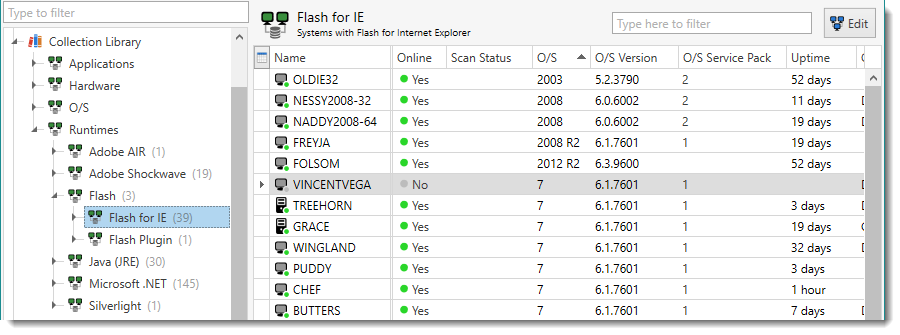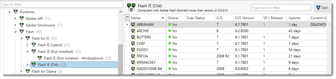 The Flash IE (Old) collection shows computers with older versions (compared to the latest version recognized by PDQ) of the Flash for IE runtime.