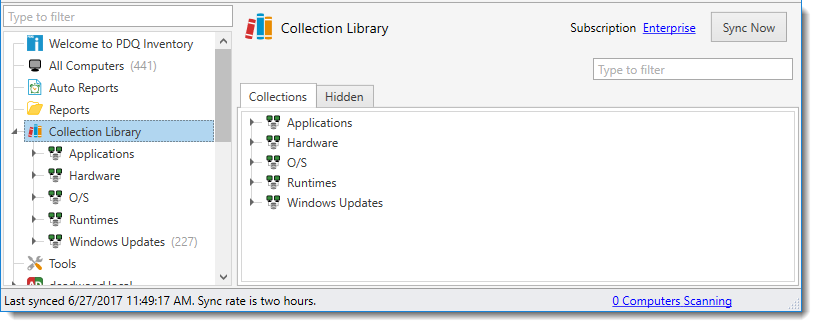 The Collection Library is synced each time you launch PDQ Inventory, every two hours by the PDQ Inventory background service, and can be manually synced on the Collection Library page.