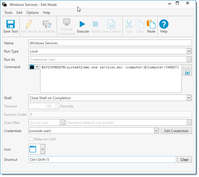 Opens the Tool window for the selected tool. Depending on the type of tool, this window may only include the ability to edit the Name, Icon, and Shortcut. For more information, see Editing a Tool. |