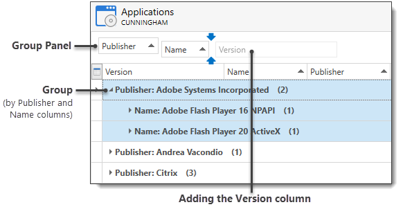 Grouping a data grid allows you to organize rows into a hierarchy potentially making it easier to navigate. With a column grouped, you can selectively view rows based on those groups. To group columns, do one of the following: •Right-click a column header and select Group by this Column •Right-click a column header and select Show Group Panel