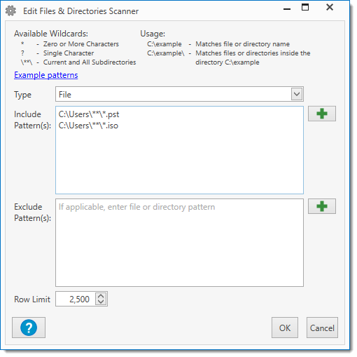 Configure the Files & Directories scanner settings in the Edit Files & Directories Scanner window (Enterprise mode required). Multiple Files & Directories scanners can be added to one scan profile with different settings per scanner. The example below will return all .pst and .iso files in the C:\Users directory including all subdirectories.