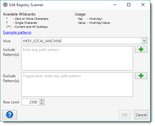Enter file patterns to match on the target computer (one per line). Click on the Plus icon •* for zero or more characters •? for single characters •\**\ for current and all subkeys NOTE: Wildcards must be used in place of regular expressions or context variables. Some examples include: •Software\Microsoft\Windows\CurrentVersion\Run\ •Software\Microsoft\Windows\CurrentVersion\RunOnce\ •Software\Microsoft\Windows\CurrentVersion\Uninstall\*\ •System\CurrentControlSet\services\Tcpip\Parameters\**\ |