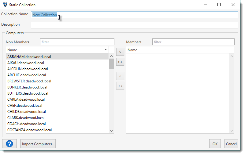 A new Static Collection window opens with the selected computers listed in the Members pane.